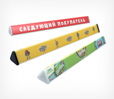 Разделитель треугольного сечения. Предназначен для разделения товаров покупателя, на кассовой ленте. Изготовлена из прозрачного пластика. В комплект входят 2 заглушки. В внутрь разделителя, может вставлятся рекламный носитель. Длина – 300 мм. Сторона треугольника 36 мм.