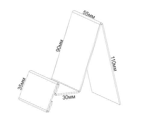 Универсальная подставка для телефона или другого подобного товара. С ценникодержателем 55х35 мм. Подставка приподнята над плоскостью. Отлично держит различные размеры и вес товаров, передний упор надежно удерживает продукцию.