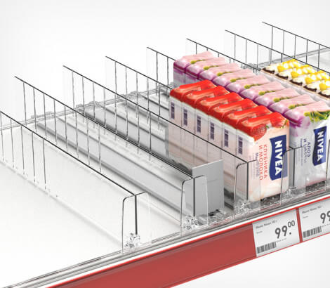 • Пластиковая задняя опора используется индивидуально или в комплекте с ребристым профилем BACKLINE. Ребристые выступы в нижней части опоры удерживают плоские упаковки товара, обеспечивая его идеальную подачу покупателю.