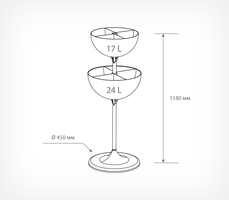 UNIBOWL-TOWER-DIV — двухуровневый дисплей для выкладки продовольственных и непродовольственных товаров в компактной упаковке. Состоит из двух чаш разных объёмов, что позволяет увеличивать объёмы выкладки и эффективность использования торговой площади. Дисплей состоит из нескольких частей, которые легко собираются между собой без использования инструмента: пластиковое основание, две трубы длиной 520 и 410 мм, пластиковые прозрачные чаши объёмом 17 и 24 литра, заглушка, защищающая полость трубы. Стандартные цвета — белый. В комплект входят разделители для деления чаш UNIBOWL на 4 секции для одновременной выкладки 4-х товарных SKU в чашах 17 и 24 л. Разделители легко устанавливаются и демонтируются без использования инструментов. Габаритные размеры: высота — 1180 мм, диаметр основания — 450 мм. Может использоваться с дополнительными опциями: информационной рамкой, ценниками, которые приобретаются отдельно.