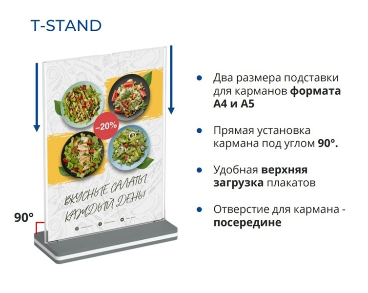 Менюхолдер OPTISIGN T-STAND — это двухсторонний вертикальный держатель информации формата А4 с прямой установкой кармана под углом 90°. Предназначен для размещения меню, рекламно-информационных листовок, прайс-листов и других материалов. Возможность быстрой замены информационных материалов. Надёжная фиксация кармана