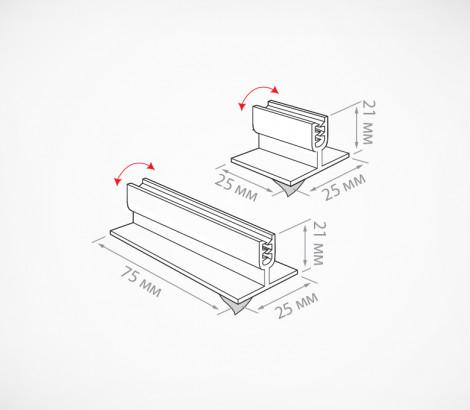 Угловой захват  на самоклеящемся основании. Держатель вывесок и основание соединены гибкой ножкой. Подходит для вывесок толщиной от 0,5 до 3 мм. Два варианта длины - 25 и 75 мм.