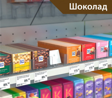 Модель имеет наклонную поверхность 75х74 мм без ограничителя. Подходит для невысоких продуктов средней и высокой тяжести, например: квадратных плиток шоколада. Можно использовать с товарами и в устойчивой, и в неустойчивой упаковке при различных комбинациях с разделителями с передними ограничителями.